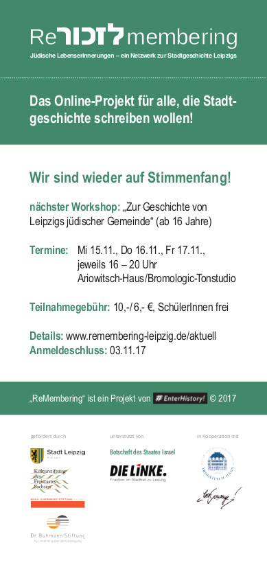 Wir verlassen das Klassenzimmer und ziehen los – in Archive und Museen, an Gedenkorte, wir treffen Menschen, die zur Geschichte Leipzigs forschen. Wir schauen uns im Stadtbild an, was fehlen würde, wenn es die einstige Einwanderung z.B. von Juden aus Osteuropa nicht gegeben hätte oder das bürgerschaftliche Engagement des schon länger in Leipzig ansässigen liberalen Judentums. Wir lernen zu sehen, was die Vielfalt und den Reichtum einer Stadt ausmacht, dass Einwanderung kein Phänomen der Gegenwart ist. Die Auseinandersetzung mit einzelnen Biografien und Lebenserinnerungen führt uns schließlich ins Radio, wir produzieren Mikrohörstücke, die unter www.remembering-leipzig.de online veröffentlicht werden und wir gehen mit den entstandenen kleinen Erinnerungen schließlich auf Sendung – Stadtgeschichte wird gemacht.
